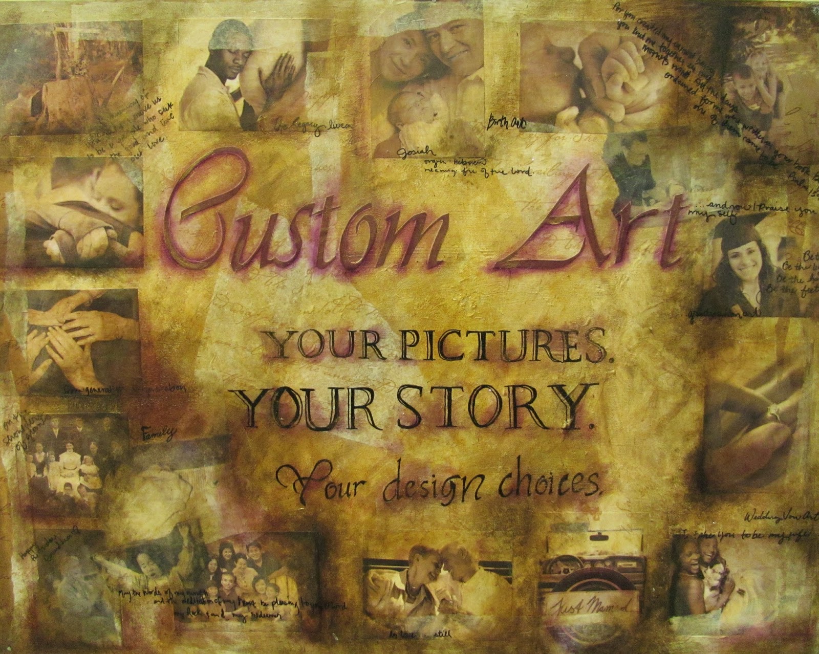 I also apply the idea of the custom photo art, picture above, for special birthdays and wedding gifts. Here is one I did for my son Josiah. I even looked up the Hebrew and wrote his name in the original language. I also included John 3:16 in the Greek and hid throughout the meaning of his name. The painting is big blocks of color using acrylic paint and tissue paper recycles from gift wrap. This was one of the first ones I did, so I traced the letters on tissue paper and decoupaged them to the top of the work.